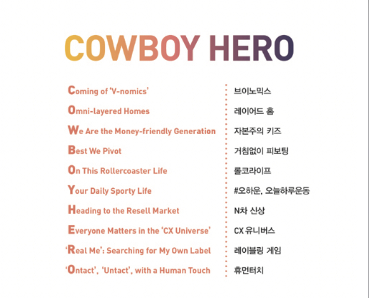 팬데믹 속에서도 평정심을 유지하자는 뜻, 백신의 기원이 된 소의 해, 현실을 직시하되 희망을 잃지 말자는 의미에서 COWBOY HERO를 2021의 10대 트렌드 키워드로 선정했다. 날뛰는 소를 마침내 길들