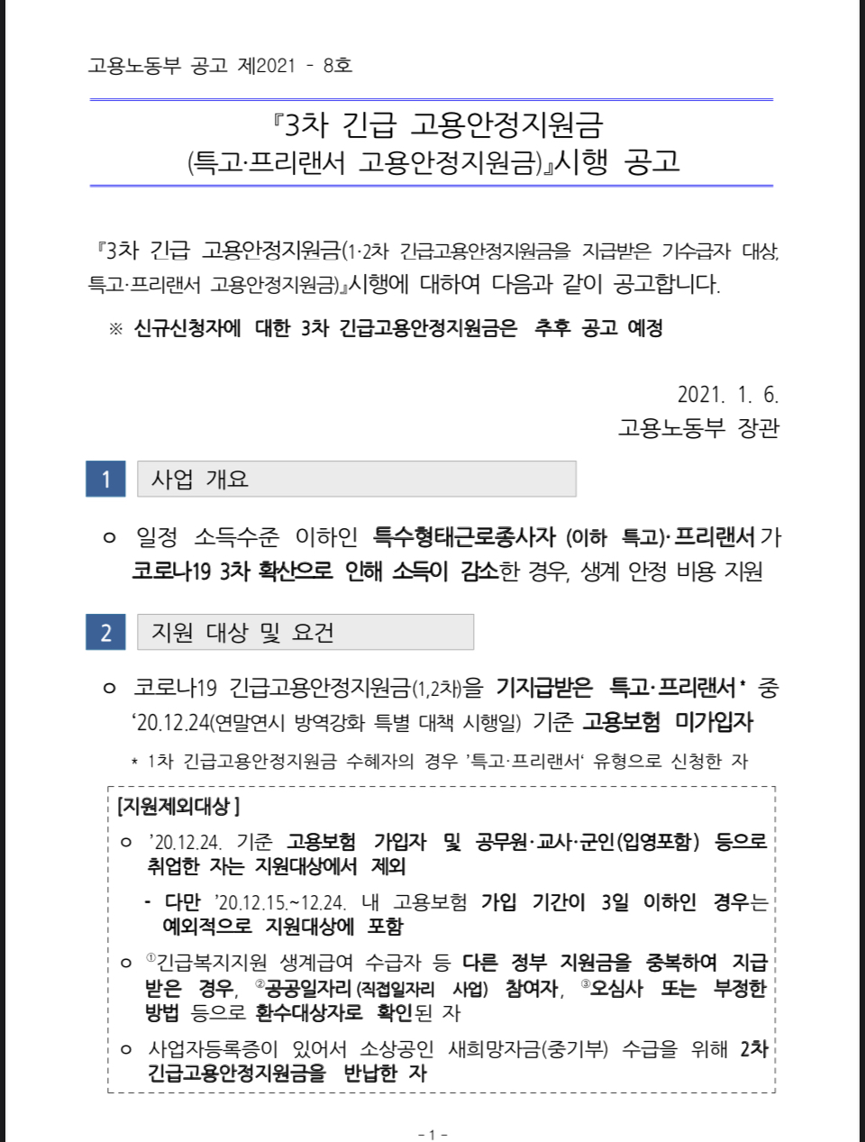 『3차 긴급 고용안정지원금 (특고·프리랜서 고용안정지원금)』 시행 공고 내용.^^
