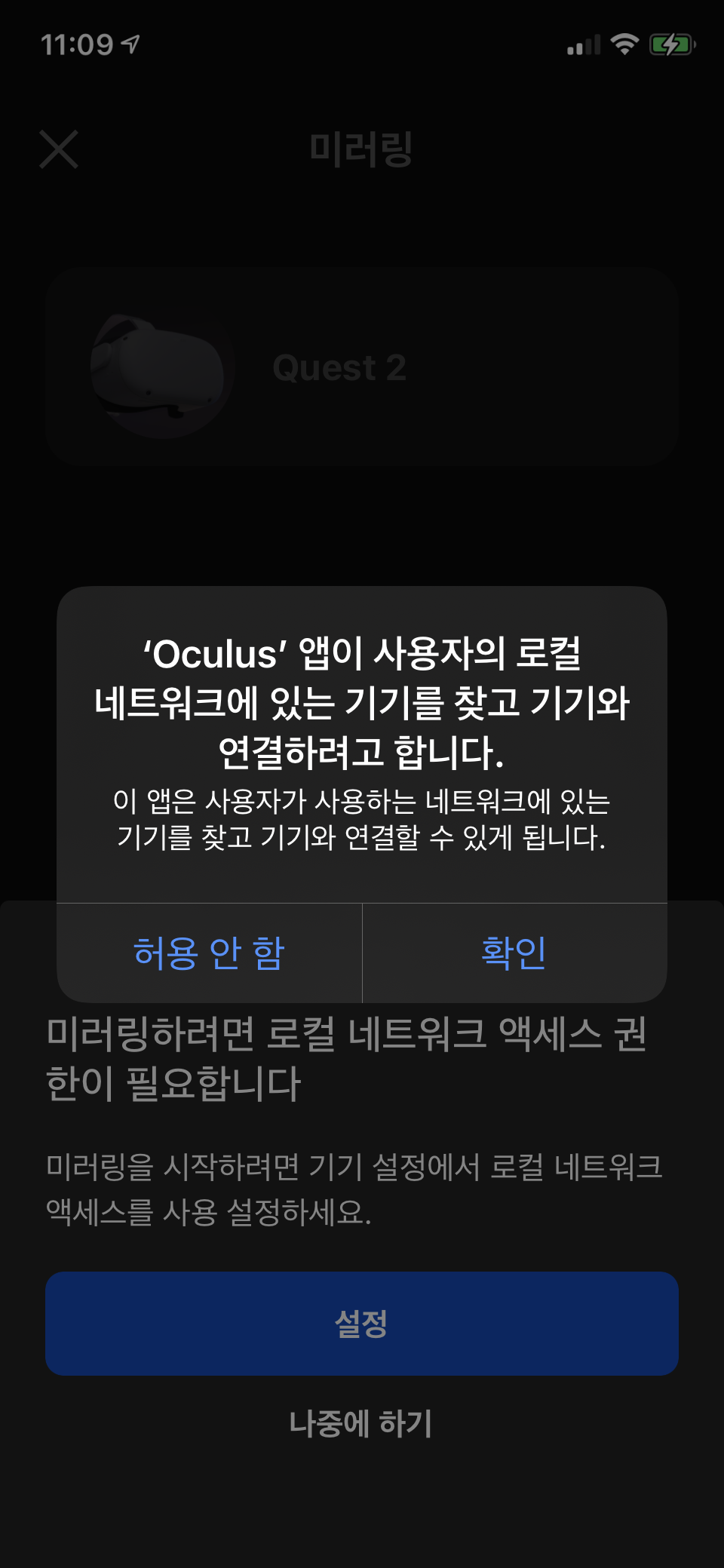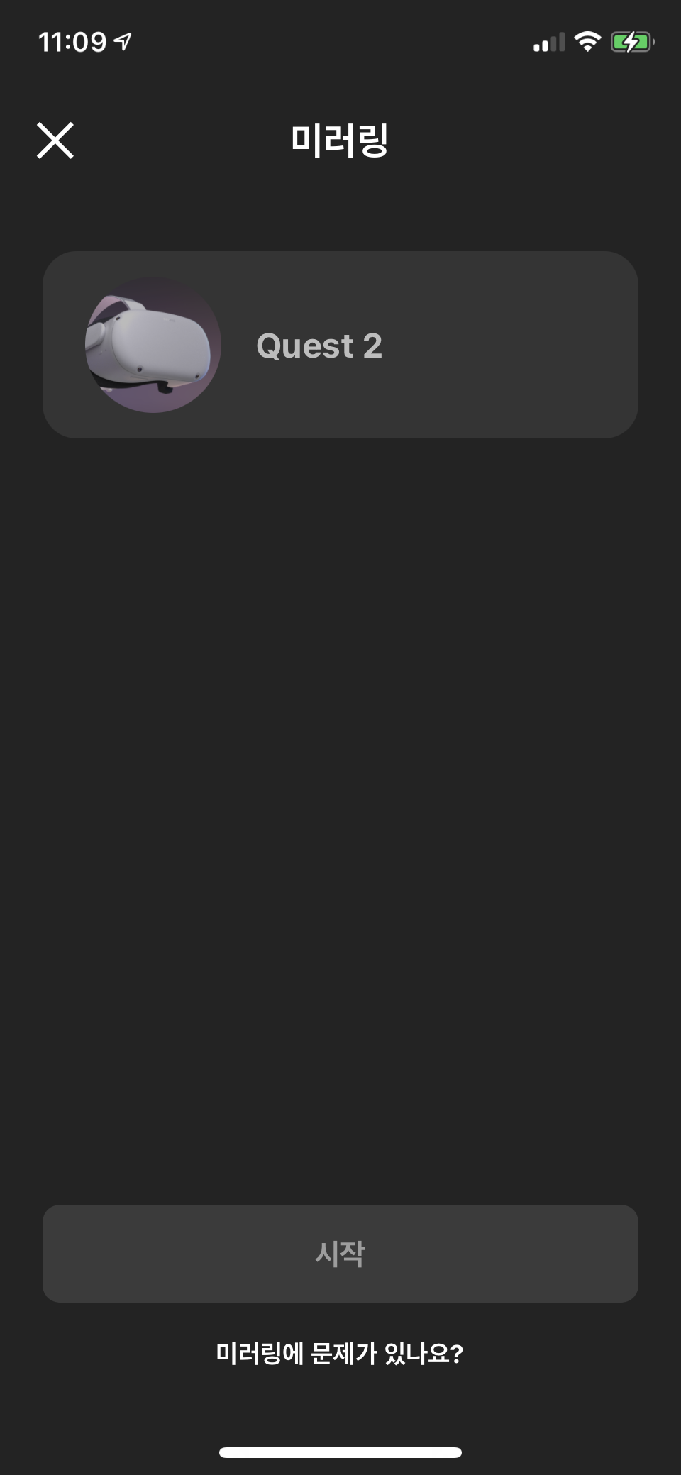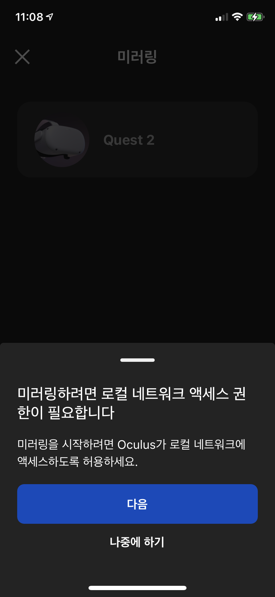휴대폰에서 이미 Oculus 앱을 연 경우에는 앱 내 메시지에서 미러링 시작을 선택합니다.