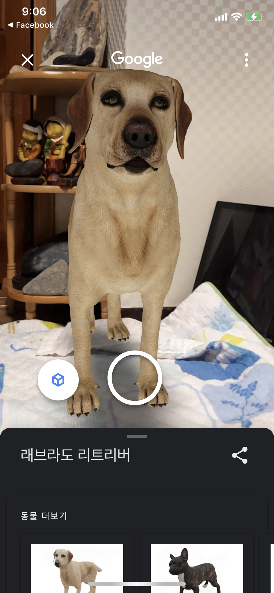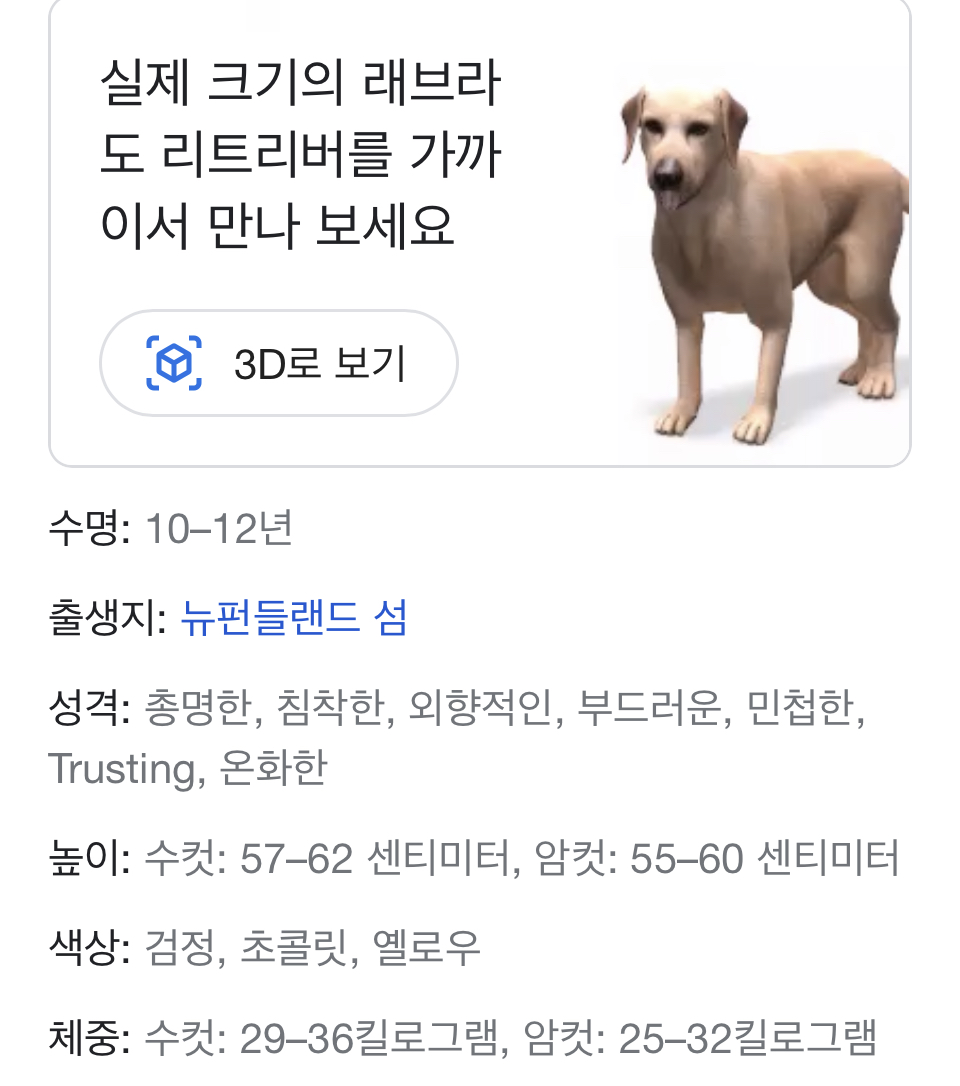 실제 크기의 동물을 확인해 보세요. Google에서 ‘래브라도 리트리버’을(를) 검색한 후 '3D로 보기'를 탭하세요.